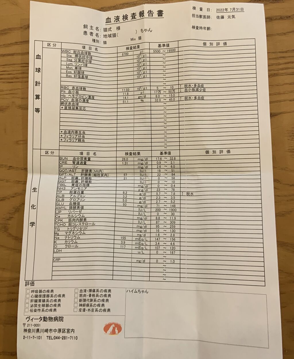 脱水関連で引っかかるも、他が問題ない(腎臓も肝臓もバッチリ)ので、気にしなくていいそうです